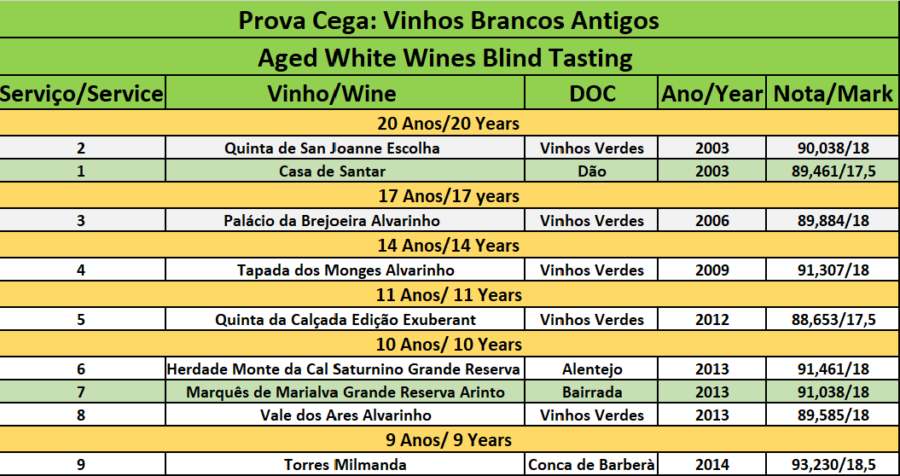 Considerações: Os objetivos da prova foram apresentar algumas referências de vinhos brancos, com idade igual ou superior a cerca de 10 anos, que têm capacidade de envelhecimento e apresentar as suas características.
